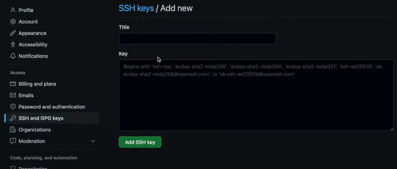 Paste the copied ssh public key content in the Key text box as shown in the picture below. Put whatever you want as Title of the key. Click Add SSH Key button to finish.